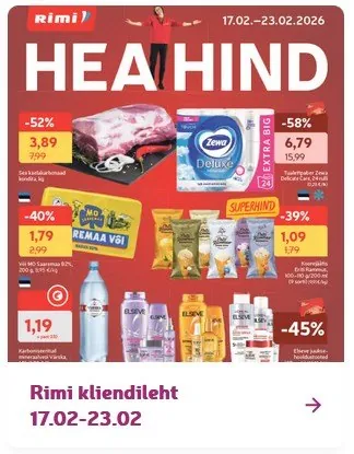 Rimi kliendileht on kindel abiline iganädalaste ostude planeeRimisel. Siit leiad kiire ja selge ülevaate kõige värskematest Rimi pakkumised, kampaaniatest ja hooajalistest soodustustest. Need kehtivad kõigis Rimi kauplused üle Eesti – alates suurematest Rimi hyper ja Rimi hüpermarket poodidest kuni väiksemate linnakauplusteni. Kui soovid ostelda läbimõeldult ja säästlikult, siis Rimi kliendilehed on suurepärane viis info kogumiseks enne poekülastust.